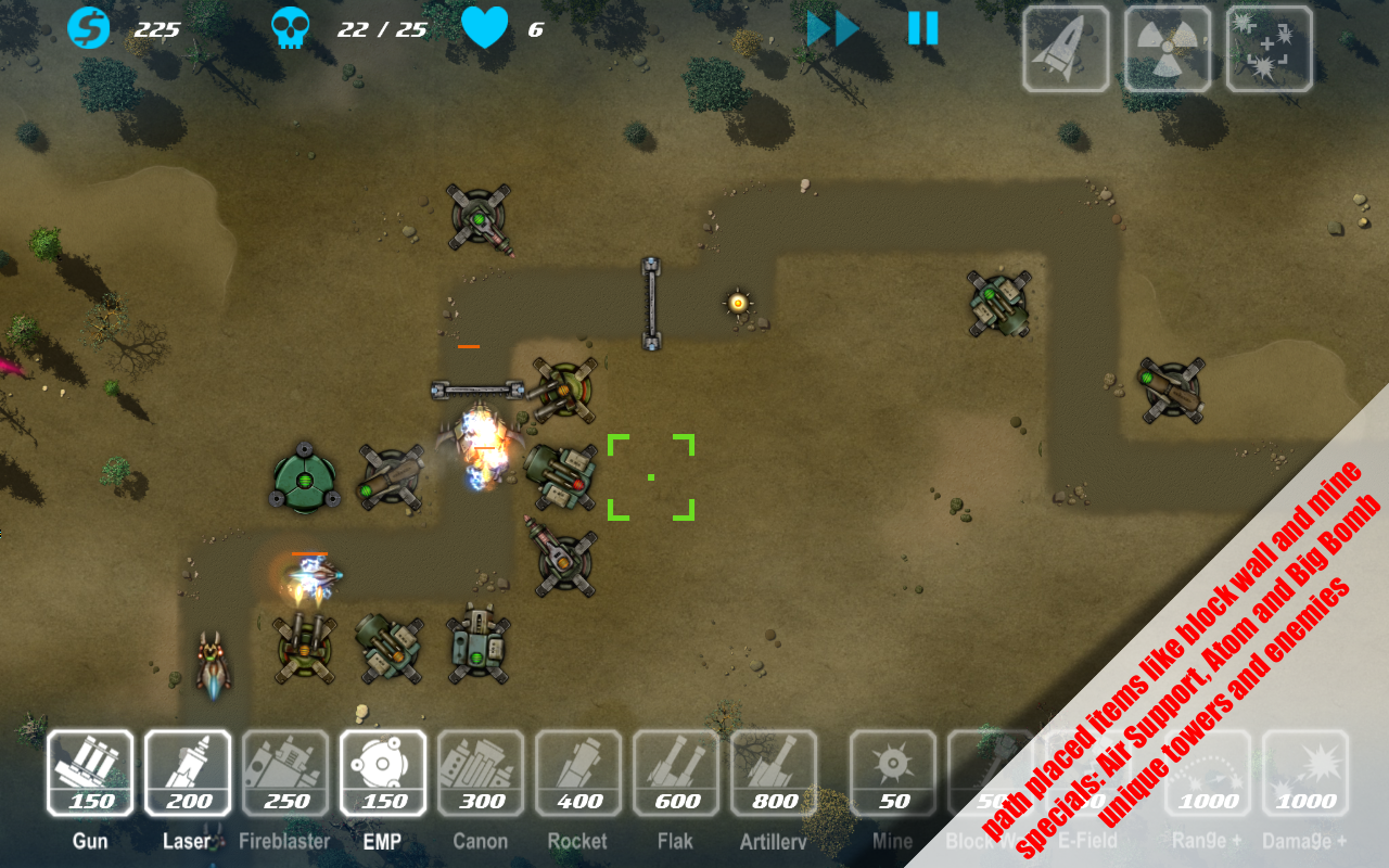 - Towers: Gun, Laser, Fireblaster, EMP, Canon, Rocket, Flak, Artillery